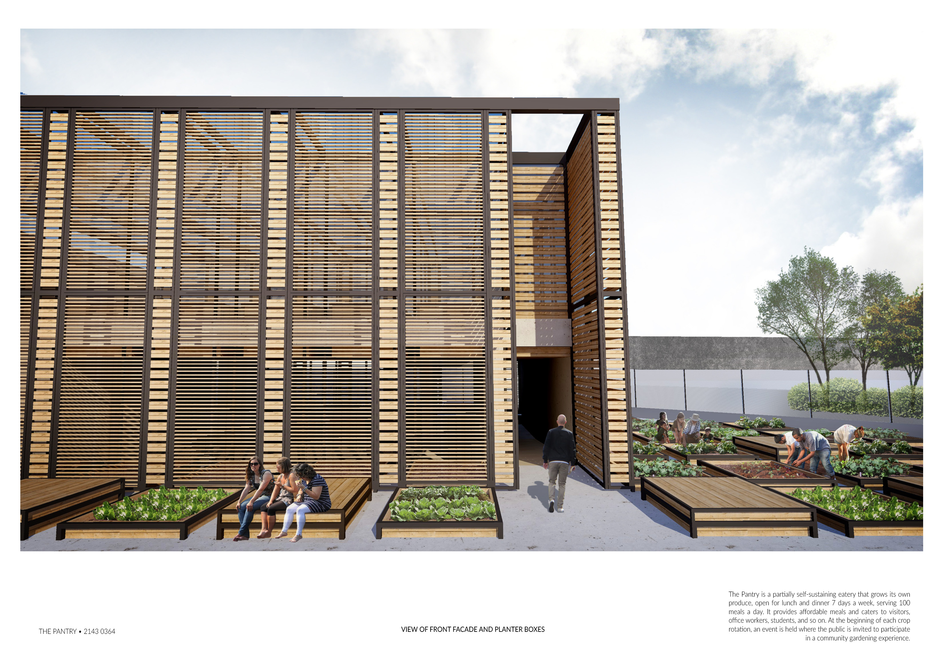 The Pantry is a partially self-sustaining eatery that invites members of the community to participate in the planting and harvesting of crops grown in the open garden. Easily accessible via train, it is a space for leisure and communal activities, activating the spaces around it.