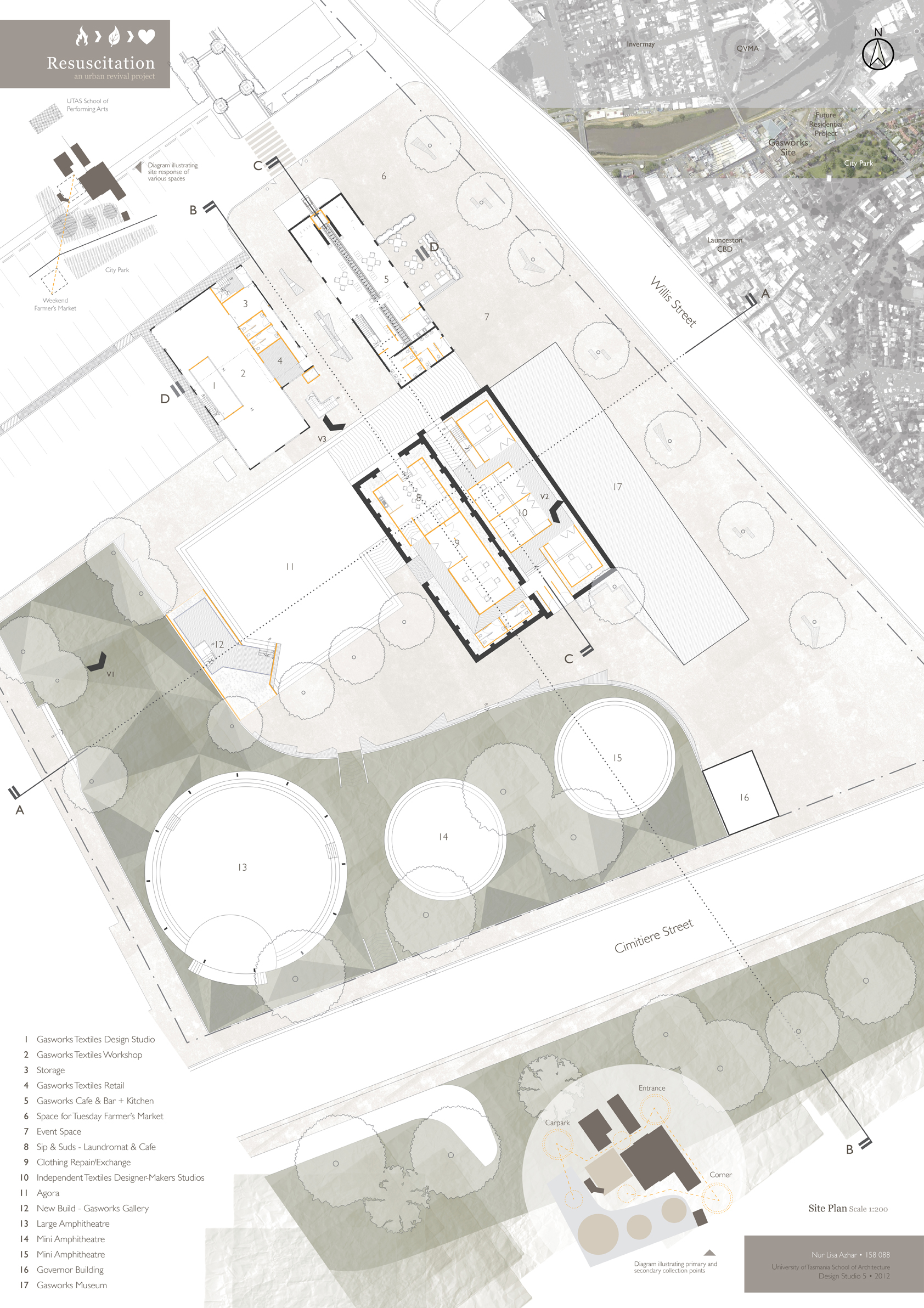 Having explored the various techniques of adaptive re-use, the final assignment was to detail the new masterplan for the Launceston Gasworks site. New uses included workshops for Textile Designer-Makers, an Agora (market space), a laundromat and cafe, as well as a multipurpose Weft space.